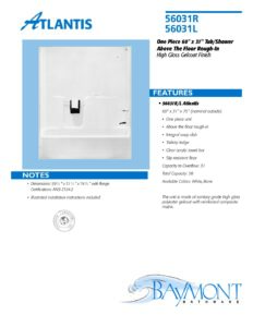 This unit is made of sanitary grade high gloss polyester gelcoat with reinforced composite matrix.