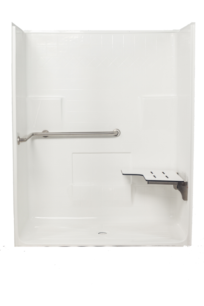 - On Model 76233S the factory supplied components to be included are one stainless steel wrap around grab bar and a fold up seat with white phenolic bench.