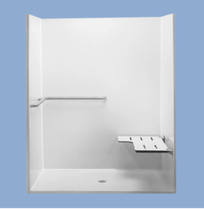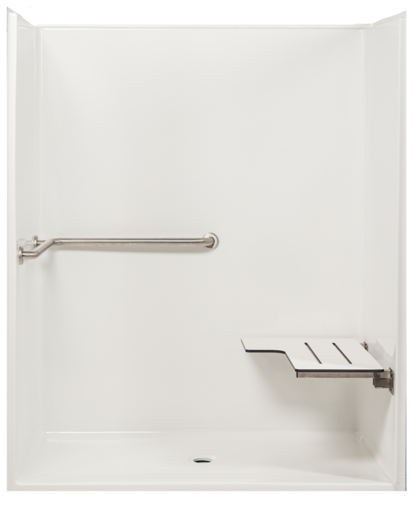 - On Model 76438S the factory supplied components to be included are one stainless steel wrap around grab bar and a fold up seat with white phenolic bench.
